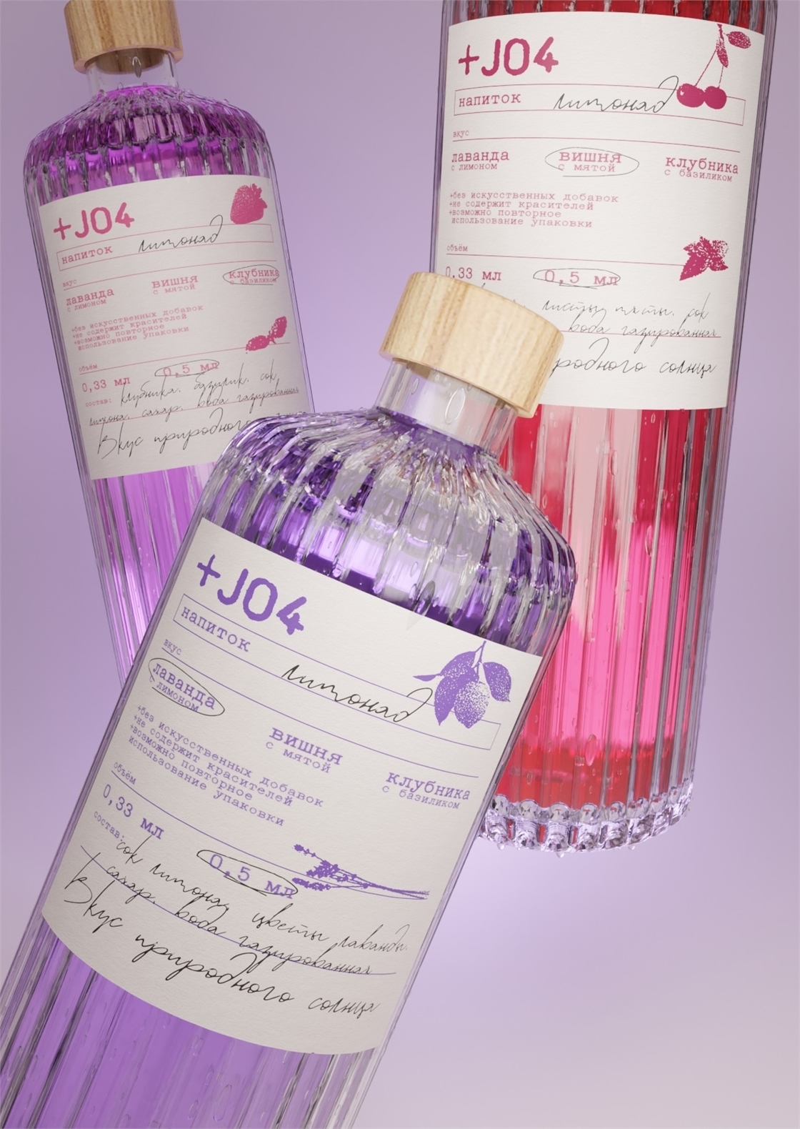 Серия состоит из трёх SKU: лаванда с лимоном, вишня с мятой и клубника с базиликом. Дабы подчеркнуть простоту и натуральность продукта, использованы сдержанные цвета, акцент на рельефе самой бутылки.