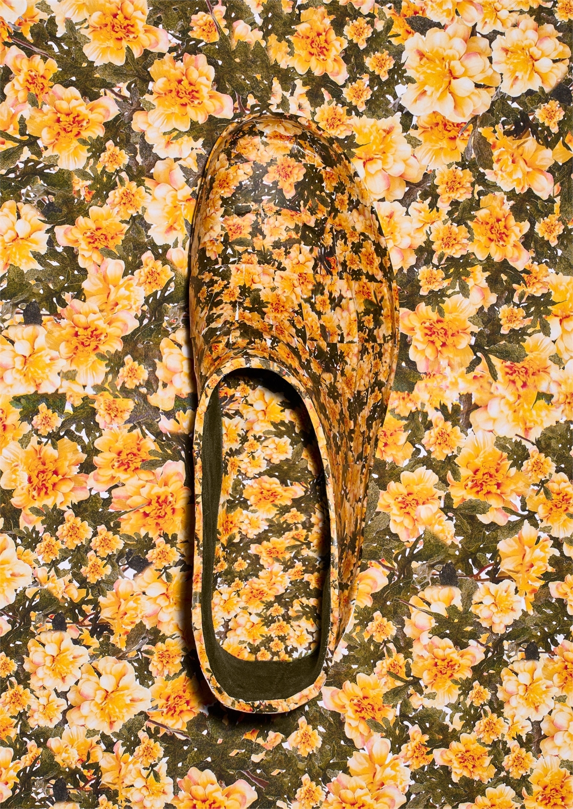 В серии цветы копируют, печатают, пересаживают на предметы. всё вокруг живое, но ненастоящее. Галоши становятся частью этой системы. Объектом, на который пересажен принт.